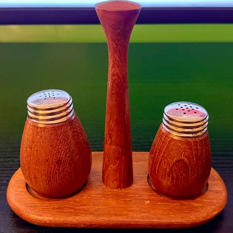 Håndlaget holder, med salt og pepper bøsse. Hull til tannpirkere. Dekorativt håndtak til løfting bak.