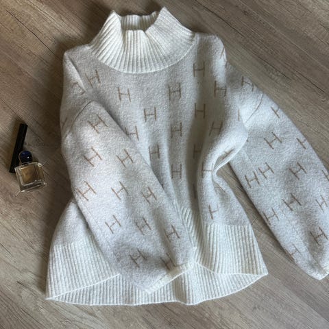 HÉST Genser i beige farge, størrelse 1. Genseren er av tynnere materiale enn de "vanlige" HÉST-genserne, kort modell og har et mønster med bokstaven H .