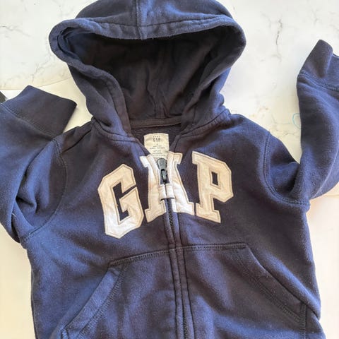 GAP Barnehettejakke i størrelse 104, blå farge. Jakken er designet for barn og passer begge kjønn. Materialet og detaljene er ikke spesifisert i bildene, men jakken har hette og glidelås foran.