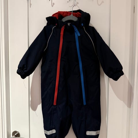 Polarn O. Pyret barne vinterdress i størrelse 80, farge svart. Dressen er unisex og laget med varmeisolerende materiale, egnet for kalde værforhold. Den har hette og hel glidelås foran for enkel påkledning. Innvendig fôr i myk fleece med mønster. Passer for små barn.