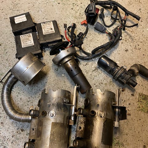 Volvo Bremsecaliper Sett brukt, består av to calipere med tilhørende elektrisk handbrekkmekanismer for bak