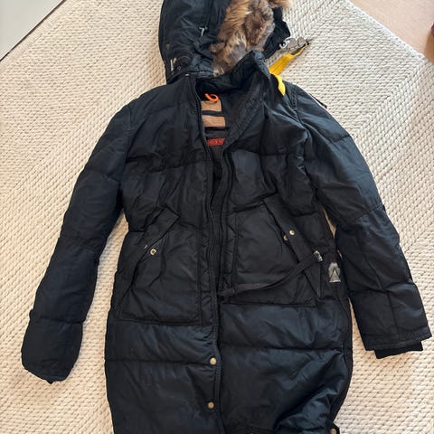 Parajumpers parkasjakke i blåsvart farge med pelshette (avtagbar pels) Jakken fremstår som ny og har ingen slitasje. Den har flere lommer foran, glidelås og knapper i front.. Materialet er slitesterkt og egnet for kaldt vær.
