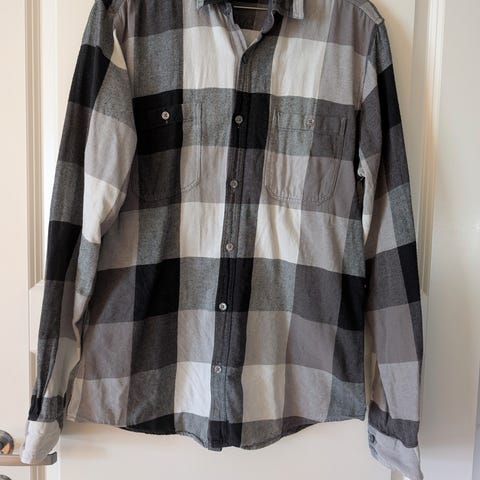 Stilig PocoLoco-skjorte i størrelse Medium. Kortermet modell med retro-inspirert rutemønster i blå, grå og hvite toner. Lett og behagelig stoff som passer både til sommerbruk og som statement-plagg under blazer. Pent brukt og uten flekker eller hull.