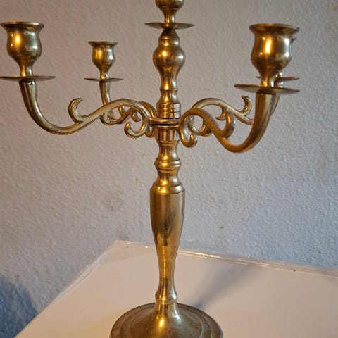 Pen messing kandelaber (stake med flere armer). Jugend stil, men denne er trolig produsert på 70-tallet. Bredde ca 27 cm. Høyde ca 24 cm. Passer normallys. Ingen skader. Jeg har to staker, men den andre mangler en lysmansjett, se bilde. Selger den som er komplett for 300, eller begge for 450.