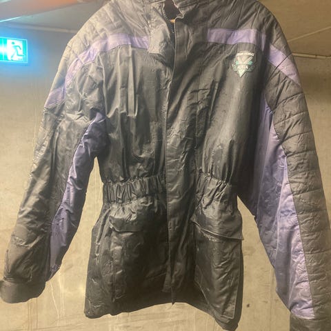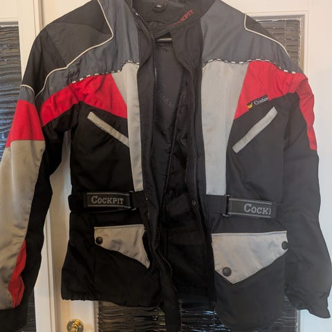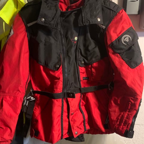 MC Jakke og bukse i rød og svart. Jakken har flere lommer og justerbare stropper i livet. Svart bukse med seler. Passer til str XXS/XS, merket 11/12. Veldig lite og pent brukt