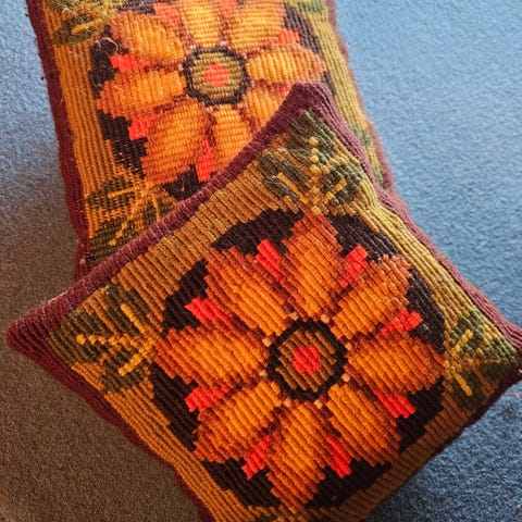 Begge putene er håndbroderte med ulike teknikker og i svært pen stand. Godt fylte, faste og rene puter – uten hull, løse tråder eller flekker.