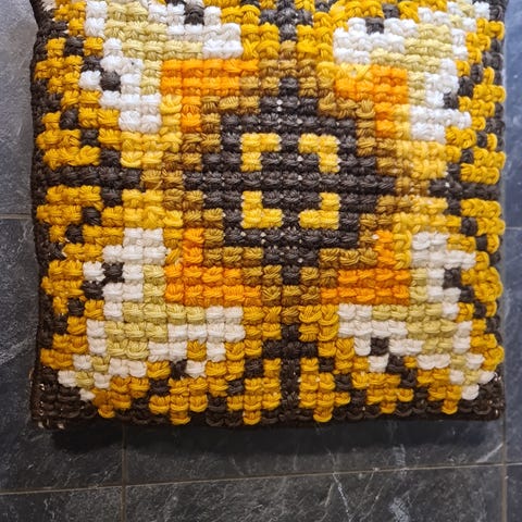 Utført med ullgarn i sterke, mettede farger.