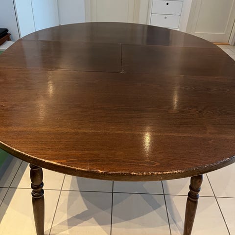 Dette er et lite rundt bord, men der det «runde» kan slås ned. Da blir det et smalt bord(25 cm bred uten klaffer). Perfekt å ha ved siden av godstolen.