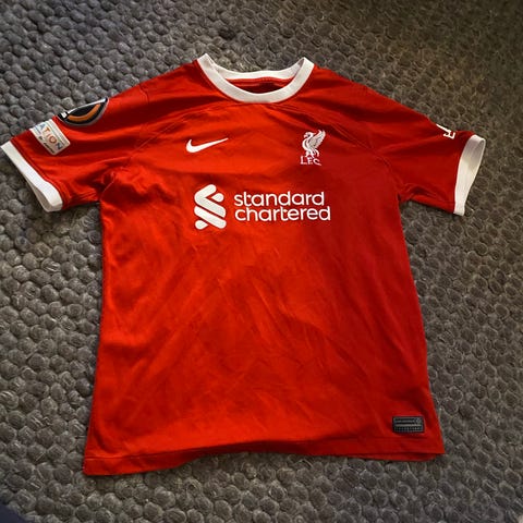 Liverpool Virgil fotballdrakt sett bestående av trøye og shorts. Trøyen er hvit med røde detaljer, og har nummer 4 og navnet 'Virgil' på ryggen. Str 28. Ca 10-13 år. Uoriginal drakt.