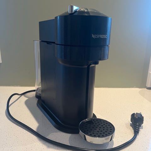 Nespresso Vertuo Next kapselkaffemaskin i svart farge. Maskinen er designet for å bruke Nespresso-kapsler og lager kaffe med forskjellige størrelser og styrker. Kompakt design som passer for hjemmebruk eller kontor. Materiale hovedsakelig plast.