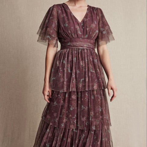 Floyd festkjole i størrelse S (passer fint også til str. M) med flerfarget blomsterprint. Rod/lysebrun tone. Kjolen er veldig lang som gjør den ekstra festlig.