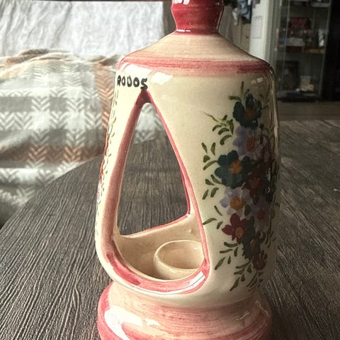 Antikk sengevarmer, også kjent som fotvarmer, laget av keramikk.