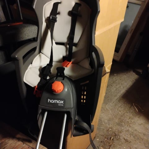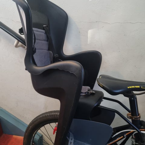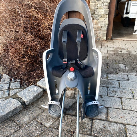 Toddler sete til sykkel med fotstøtter og hjulbeskytter.