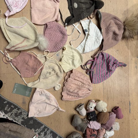 Luer for barn i størrelse 0 - 3 mnd, i fargene rosa/lilla. Luene har knyting under haken og materialet er mykt og egnet for barnets komfort.