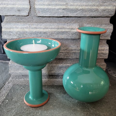 Keramisk kaffeservise /teservise i blå og beige farger. Inkluderer tekanne med lokk, melkekanne, sukkerskål, åtte kopper med underkopper, og en lysestake. Serviset har en rustikk, håndlaget finish med signatur på undersiden.