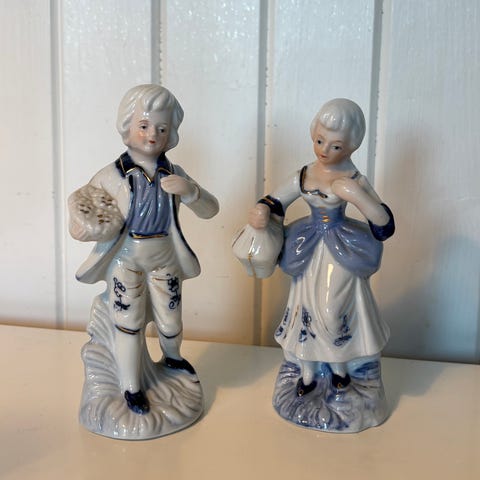 porselensfigurer, sett med to figurer i historiske klær. Figurenes farger inkluderer blå, hvit og grå. Materialet er porselen, og de har detaljerte malte ornamenter. Duer hører symbolsk med. Passer til dekorasjon eller samling. 18 cm høye og 8 cm bred. Prisen er pr stk.