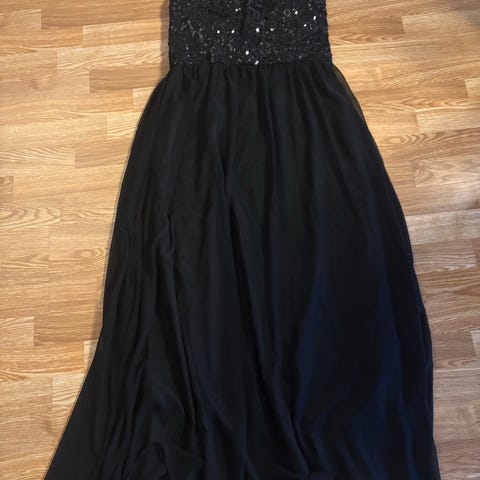 Fotsid festkjole i størrelse L, svart farge. Laget av 100% polyester ytterstoff, 81% polyester og 3% elastan fôr, med chiffon materiale. Kjolen har dekorative detaljer på overdelen og har strikk i ryggen. Kommer med sjal. Brukt to ganger