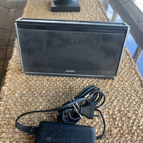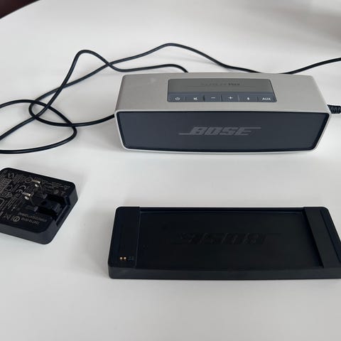 Bose SoundLink Mini Bluetooth-høyttaler i sølvfarge. Kompakt bærbar høyttaler med trådløs Bluetooth-tilkobling. Utstyrt med kontrollknapper for volum og avspilling på toppen. Leveres med ladestasjon og strømkabel. Egnet for trådløs musikkavspilling fra kompatible enheter.