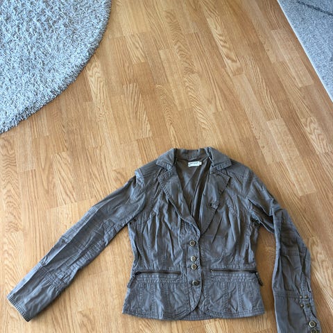 Selger en flott, brun, innsvinget jakke i naturtro kunstskinn. Den er i str S. Den har to utvendige lommer med glidelås. Sitter veldig godt over skuldrene og har fin glidelås og delvis knappelukning. Jakken har ikke vært i bruk. Selges for 160 kr + 69 kr i porto (Postnord)