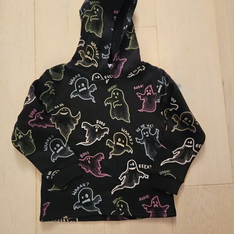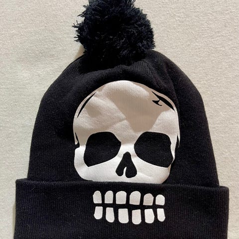 H&M Svart barnelue i størrelse 110 for unisex. Lua har et trykk av et hvitt skjelettansikt på forsiden. Den er laget i et mykt materiale som passer for barn.