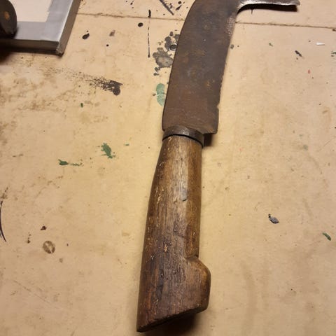 Lauvkniv, løvkniv, kvistkniv, gammel kniv, landbruksredskap, gammelt verktøy, antikk verktøy, eldre håndverktøy, norsk landbruk, gårdsredskap, smidd kniv, bygdesmie, patina, vintage verktøy, hytteinteriør, verksteddekor, samlerobjekt, rustikk dekor, skogsredskap