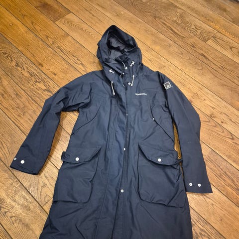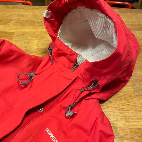 Pent brukt grå regnjakke fra Didriksons selges. Str 36, men oppleves større ( bruker vanligvis str 38/40) to store lommer med knapp foran. To stikk lommer med glidelås oppe i front. Stramming nede, i livet og ved hetten. Stor og god hette. Lukkes med glidelås og knapper.