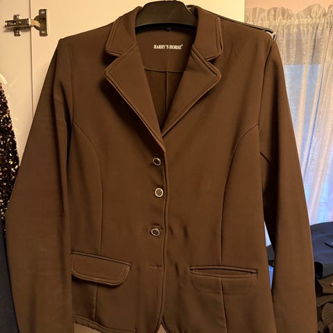 Pent brukt svart stevnejakke fra Covalliero i str L. Den er ganske liten i størrelsen og passer for de som bruker en større S eller M. Hvis du har sikkerhetsvest under, passer den bedre mot en stor S/liten M. Begge lommene er ekte og har hvertfall plass til en telefon.