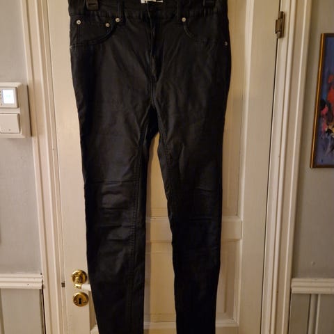 Tøff svart bukse i stretch str. 44 med skinn etterligning og glidelåser på lår.