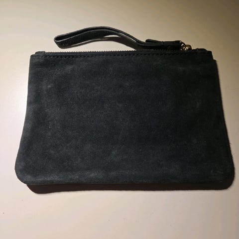 Imitert semsket skinn, svart. Litt slitt under i bunnen. En lomme med glidelås på utsiden. En liten lomme med glidelås og en "mobillomme" på innsiden. 28×30cm