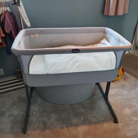 Titaniumbaby Co-Sleeper (bed side crib) i god stand selges. Mørk grå/blå farge. Seng og madrass er vasket. Justerbar i høyde, madrasskant, mellom 35-52cm. Justerbare føtter inn mot sengen. Stropper til å sikre. Alt utstyr følger med. Skåredalen, Haugesund