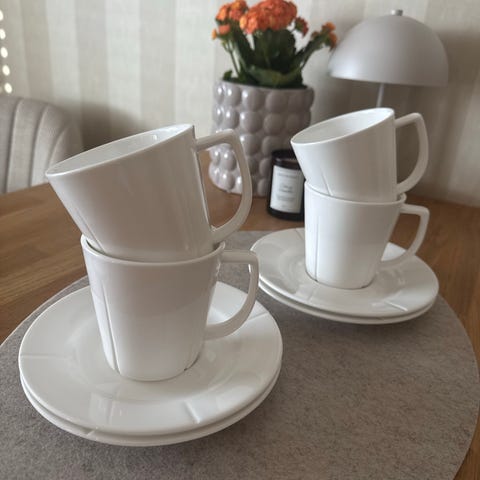 Rosendahl kaffekopper og skåler i hvitt porselen. Settet inkluderer flere kopper med tilhørende skåler, egnet for servering av kaffe. Materialet er porselen, og designet er enkelt og funksjonelt.
