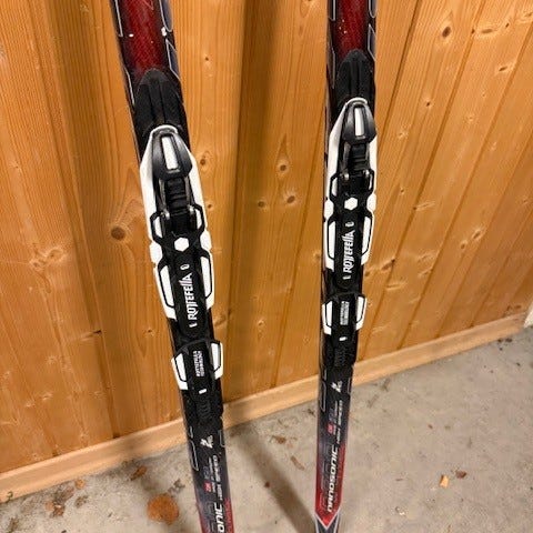 Madshus ski 195 cm NNN binding 100kr pr par. Røde ski med salomon binding og godt brukt.