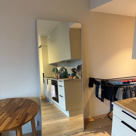 Stort speil fra ikea. Svart farge. Måler 78x196 cm. Ingen skader. Oppheng til vegg følger med om ønskelig.