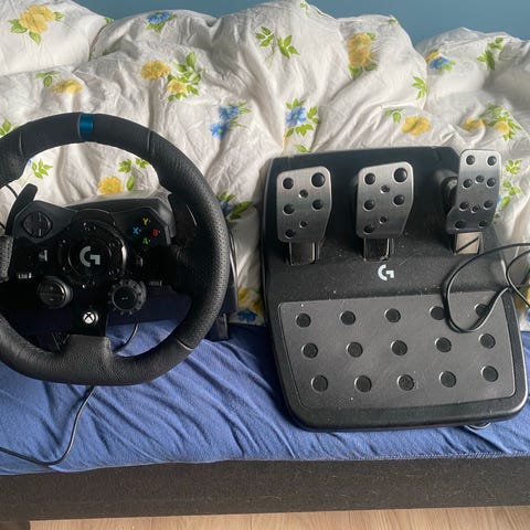 Thrustmaster T248 ratt og pedalsett, USB-tilkobling og kompatibilitet med PlayStation og PC. Rattet har flere kontrollknapper og en solid base for montering.