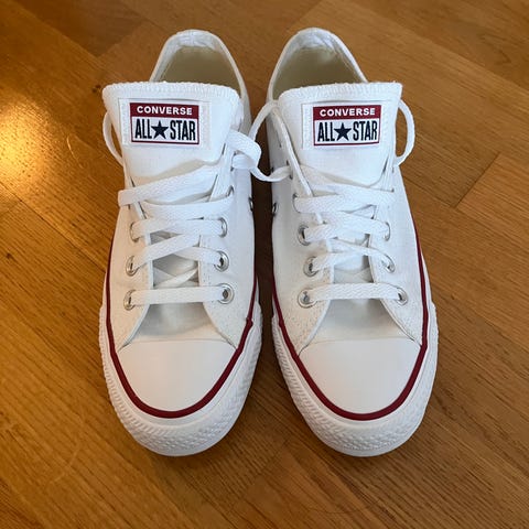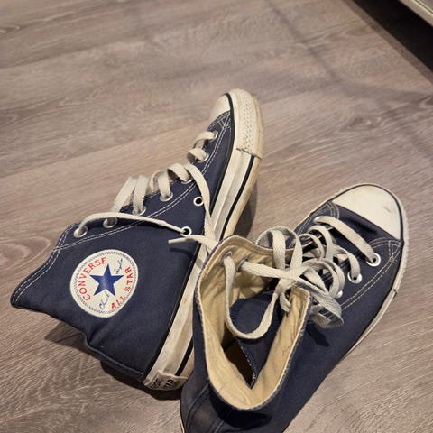 Pent og lite brukt converse sneakers str 38. Noen flekker frampå tuppen, se bilde. Mulig det kan vaskes vekk. Brukt 2-3 ganger.