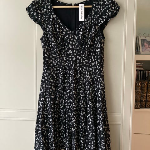 Pia Tjelta Hverdagskjole i størrelse S med svart basefarge og blomstermønster. Kjolen har lange ermer og er laget for kvinner. Passer til hverdagsbruk.