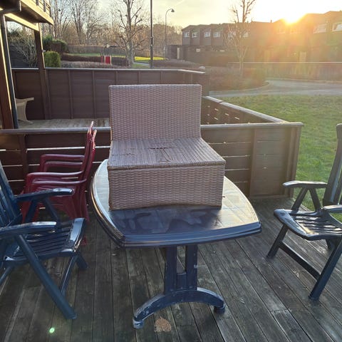 Utemøbelsett i rotting med glassbord og fire stoler fra Skeidar