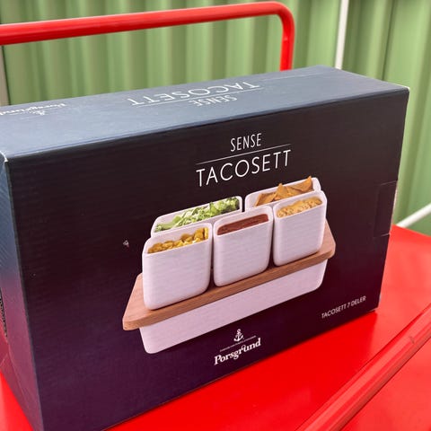 Taco-sett 7 deler består av seks porselensskåler, en stor form og et praktisk trebrett. Skålene og formen er laget av høybrent porselen for solid kvalitet og lang holdbarhet. De tåler jevnlig vask i oppvaskmaskin, kan fryses og brukes i mikrobølgeovn. Med sin kompakte størrelse er settet en bestselger hos Porsgrund Porselænsfabrik, og det passer enkelt inn i skapet.