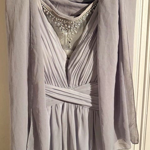 Kjole brukt i bryllup. Stroppeløs lilla i et glatt stoff med fint fall.