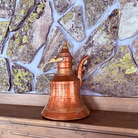 Kobberkanne med lokk og håndtak, laget i kobbermateriale. Kannen har en konisk form med dekorative detaljer på lokk og håndtak.