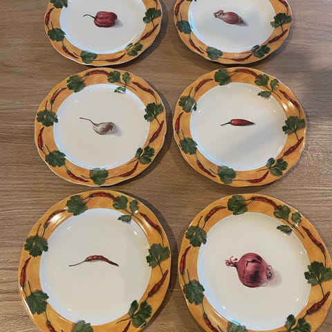 Sett med 4 tallerkener dekorert med motiv av skalldyr, inkludert reker, skjell og sitronbåter. Tallerkenene er laget av keramikk og har et maritimt tema med detaljer i farger som rød, grønn, svart og beige. Passer til servering av sjømat eller annen mat. D: 34 cm. Sterke farger. De er hele uten sprekker eller hakk men alle har noe krakelering. Selges samlet for 150kr.