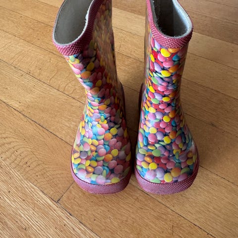 Viking Barne Gummistøvler i størrelse 35, designet for jenter. Støvlene er lilla med mønster og har en slitesterk gummisåle. Egnet for bruk i vått vær og gjørme, med et komfortabelt innvendig for.
