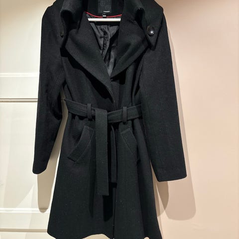 Unik Hugo Boss kåpe i svart, størrelse 34 (XS) for dame. Kåpen har en enkel og klassisk design med knappelukking og metallspenne i front. Laget i et materiale som gir struktur og varme. Passer til formelle og hverdagslige anledninger.
