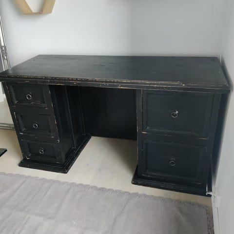 John Texmon. Skrivebord. Teak og sort melamin. Modell Ola-pulten. Produsert av Blindheim Møbelfabrikk. Tegnet og i produksjon fra tiden rundt 1957. H. 70/98. L. 104. D. 55. (Blomqvist Nettauksjon)