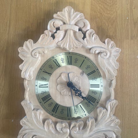 Klokken har svarte visere og batteridrevet mekanisme på baksiden.