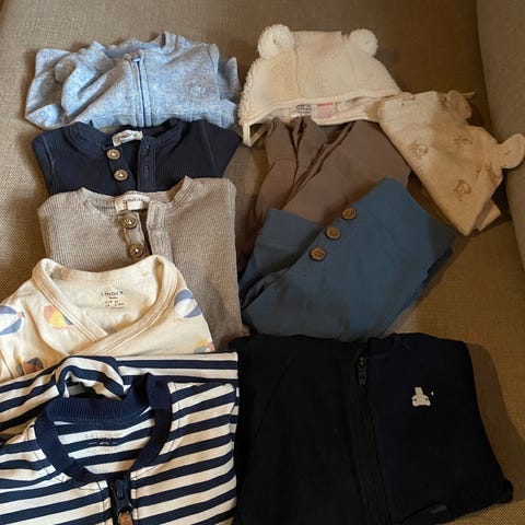 Klespakke med flere plagg i størrelse 68 for gutt. Inkluderer ulike typer klær som 6 bukser, 1 snekkerbukse, 2 skjorter, 7 langermet body, 2 kortermet body, 3 pysjamas, 2 heldress i bomull og 1 fleece dress.