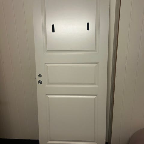 Brukt Dooria innendør. Tung/massiv. Solid. Noen overfladiske bruksmerker (først og fremst mot toppen av døra), se nærbilder for disse. Døren har vært lagret tørt. Er grovvasket på bildet.
