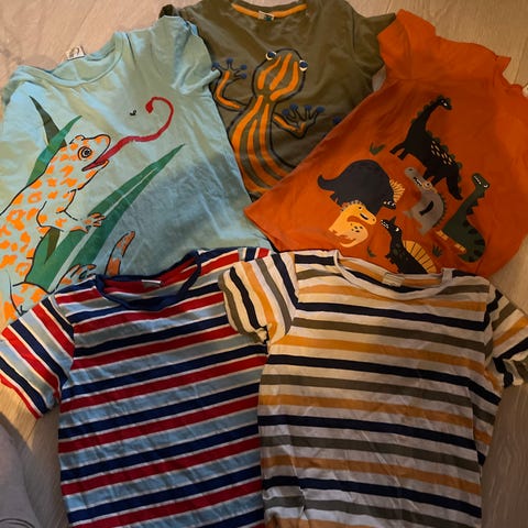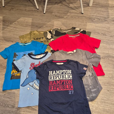 Pakke med barn T-skjorter for gutt i størrelse 104. T-skjortene kommer i ulike farger og mønstre, laget i ulike materialer egnet for barn.