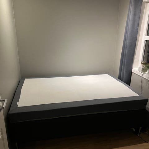 Seng med treramme og hvit madrass. Rammen består av flere trelameller for støtte. Madrassen er hvit med stofftrekk.