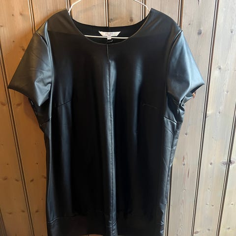 Ane Mone skinnkjole i svart farge, laget av ekte lammeskinn. Kjolen har størrelse 38 og er designet for kvinner. Materialet er mykt og slitesterkt skinn, egnet for hverdagsbruk og fest. Lengde bak fra skulder og ned: 87 cm.